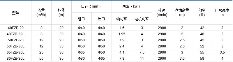 FZB系列自吸離心泵,過流部件采用氟塑料合金制造,設(shè)計(jì)新穎、可靠、操作方便。本產(chǎn)品廣泛運(yùn)用于化工、農(nóng)藥、制酸制堿、造紙、酸洗工藝、電子等行業(yè)。適用溫度:-20℃至95℃。 最特出的優(yōu)點(diǎn)是具有自吸功能,采用外循環(huán)式自吸結(jié)構(gòu),自吸功能力強(qiáng),吸上時(shí)間短。自吸高度可根據(jù)用戶需要,在1至3米內(nèi)選擇,因具有自吸功能,安裝相對(duì)非自吸泵方便的多。