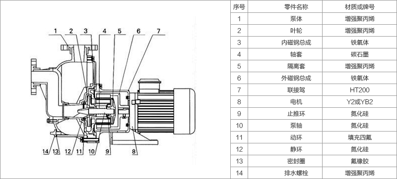 過流部件材質(zhì):PP(增強(qiáng)聚丙烯)、PVF2(聚偏二氟乙烯)